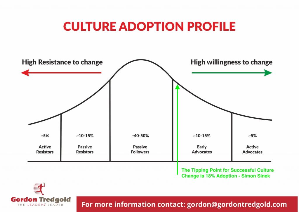 The culture/change adoption profile for any organisation is very similar to the diffusion of innovation bell curve. You have your active advocates, early adopters and then at then other end the active resistors.
